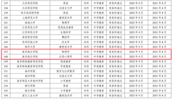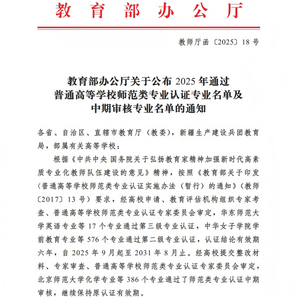 近日,教育部办公厅发布《关于公布2025年通过普通高等学校师范类专业认证专业名单及中期审核专业名单的通知》(教师厅函〔2025〕18号),我校物理学与应用心理学专业通过第二级专业认证,认证结论有效期六年(2025年9月至2031年8月),英语与历史学专业通过中期审核,继续保持原认证有效期。